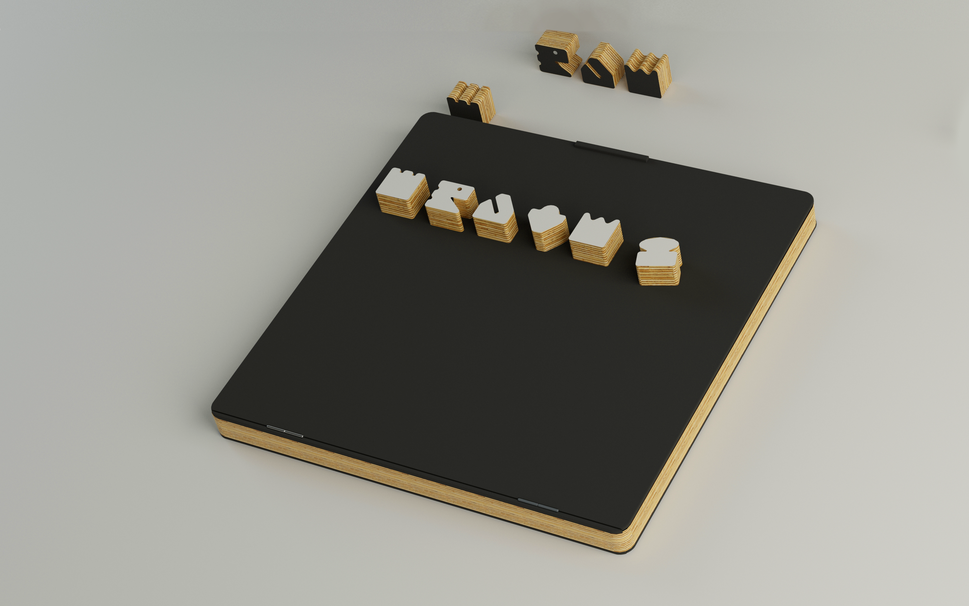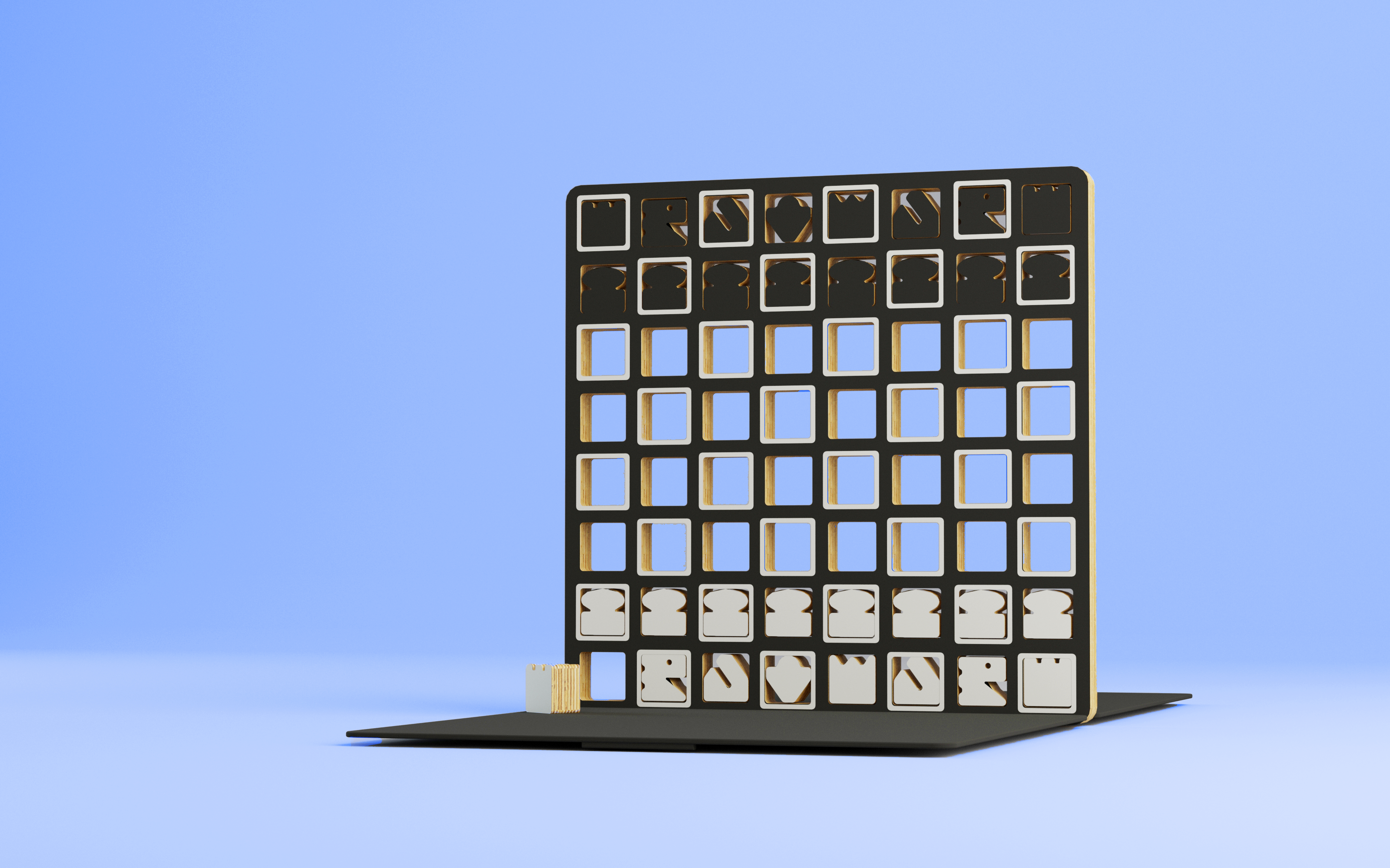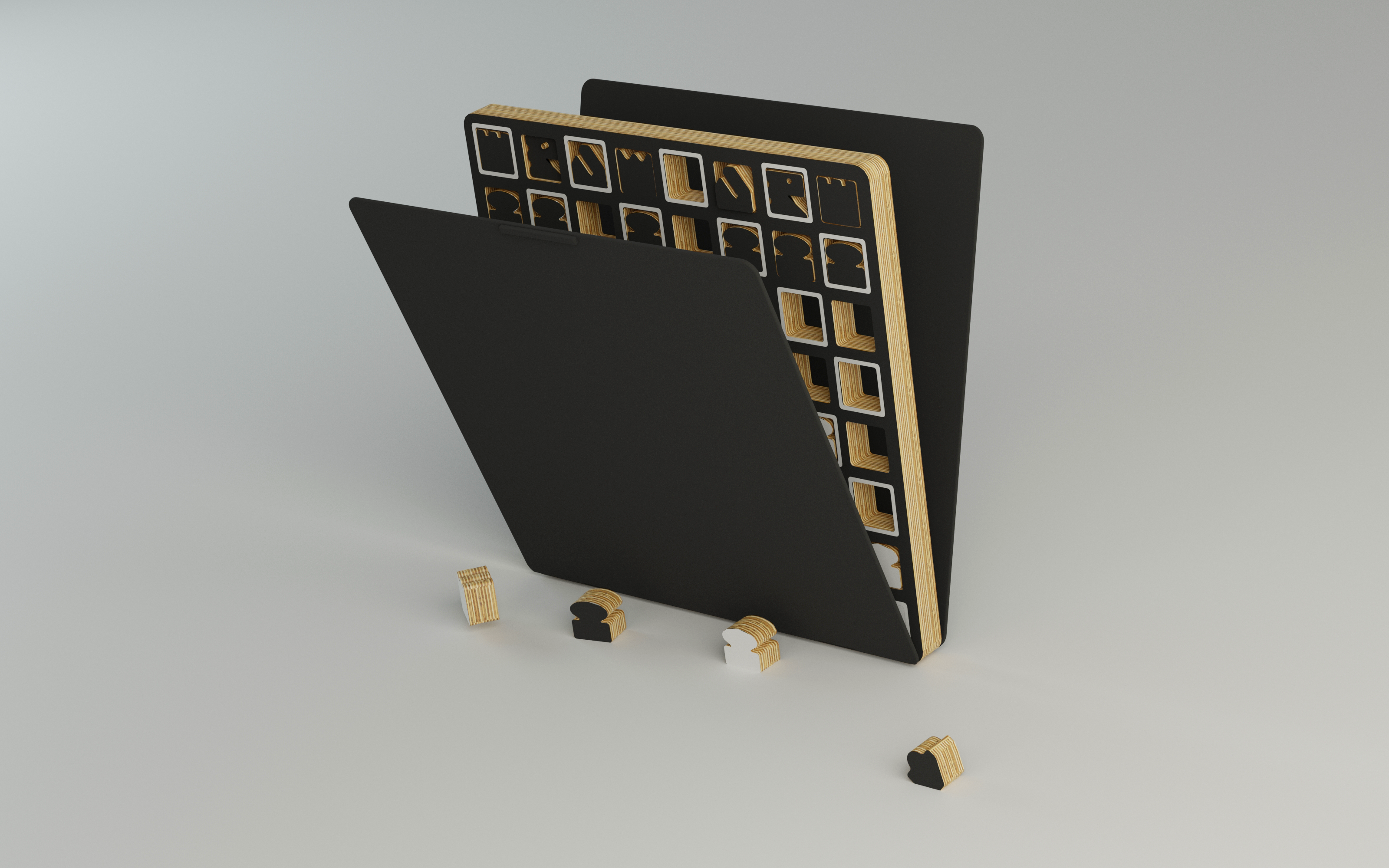 This chessboard was created with the thought of saving a game since they can last often for hours. Just close the chess board like a book and you will have a safe chess game ready for transport. This simple idea affected the entire design and material of the game – inspired by online chess you will play from top to bottom and the other way around.